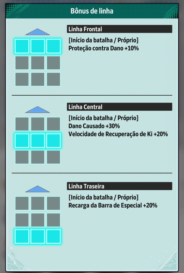 No início da batalha, seu personagem será fortalecido com o "Bônus de Linha", com base na linha em que foi posicionado.